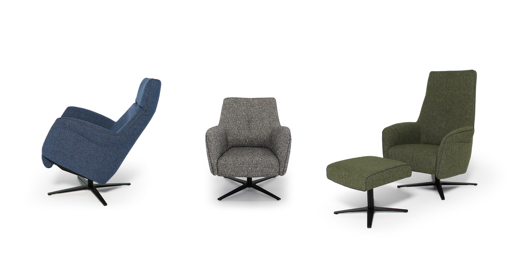• Вращающееся кресло с низкой спинкой на шарнире, доступное в фиксированном варианте или с реклайнер механизмом (подножка выдвигается, а спинка откидывается)